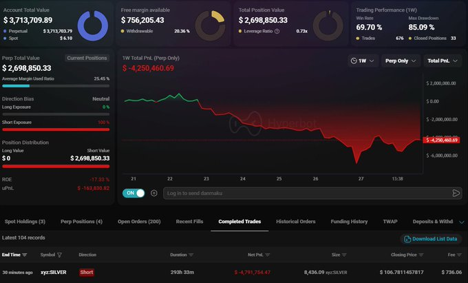 According to Hyperbot’s real-time tracker, the whale manually executed a market close on the Silver position earlier today.