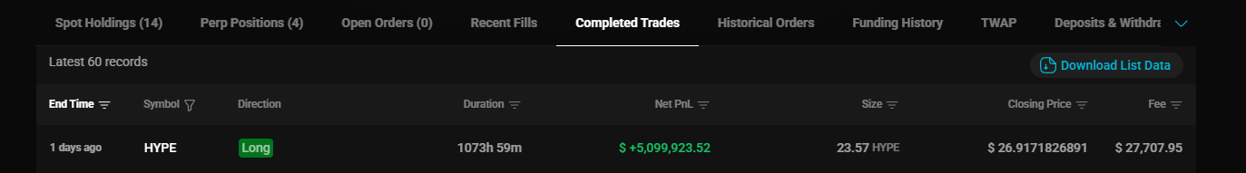 Many traders fall victim to greed when staring at massive floating profits, eventually round-tripping their gains. However, when the price of HYPE dropped below the $30 mark, Loracle decisively shifted his strategy. He began consistently securing profits through high-frequency, smaller sell orders. After six consecutive days of scaling out, he fully closed his massive HYPE long, realizing approximately **$5.09 million** in pure profit.