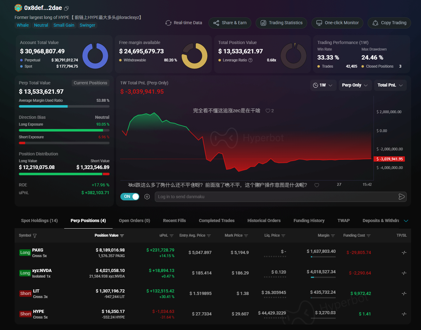 - Tanking the Drawdown Calmly: The dashboard shows a 1-Week Total PnL drawdown of roughly $3.03 million. This was likely the profit shrinkage during the final leg down before he closed his HYPE position. However, because of his extremely low leverage and high margin ratio, this drawdown posed zero existential threat to his portfolio.
