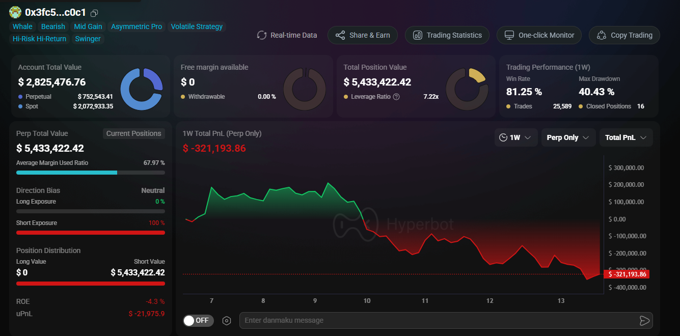 - Liquidity Exhaustion: The Perp account is currently suffocating under a $5,436,194.53 pure 100% short exposure. Following a severe 1-Week PnL drawdown of -$324,081.68, the Free Margin has been ruthlessly drained to a critical $6,658.35 (a mere 0.88%).