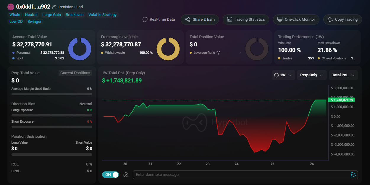 In the unforgiving arena of crypto derivatives, traders who can consistently compound wealth across market cycles are exceedingly rare. The ENS domain holder "pension-usdt.eth" 0x0ddf9bae2af4b874b96d287a5ad42eb47138a902 has proven to be an apex predator on the Hyperliquid exchange.