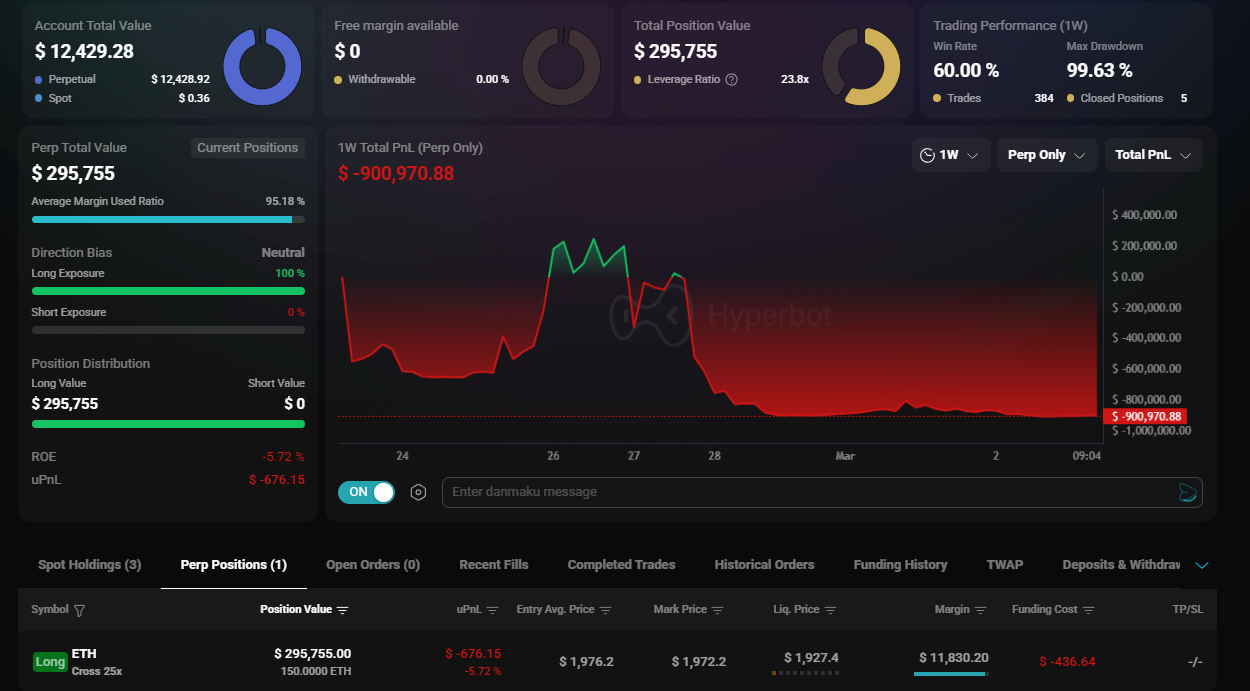 3. The Cross Margin Black Hole Under the Cross Margin model, the entirety of a wallet's available balance is collateralized against floating losses. When a position goes deeply underwater, the protocol ruthlessly siphons wallet liquidity to keep the multi-million dollar position alive. This dynamic rapidly drained Machi’s wallet down to $9k, stripping him of the capital needed to deploy rescue capital at true market bottoms.