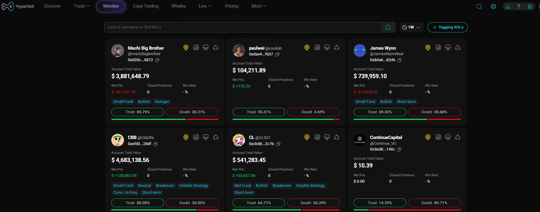 The "Discover" section is more than just a leaderboard; it is a "High-Value Watchlist" pre-cleaned for you by Hyperbot’s AI algorithms.