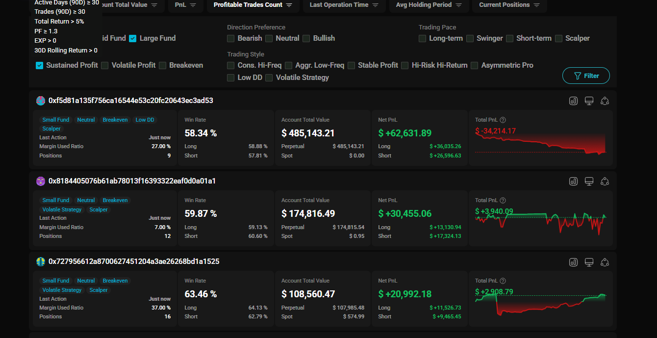- Confluence: Check the address's Open Positions. If multiple addresses fitting the "Steady Growth Formula" are all Longing the same token, that is an extremely strong entry signal.