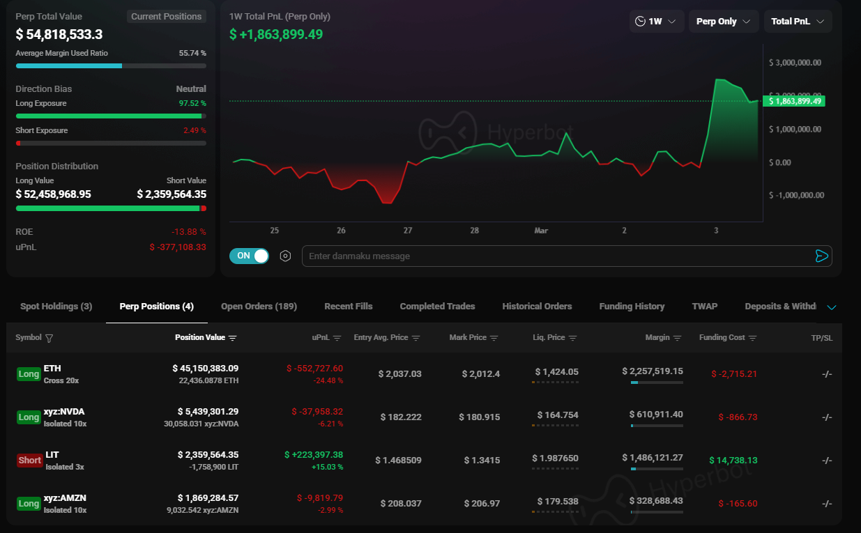 In the complex arena of crypto derivatives, the structural positioning of top-tier capital serves as a leading market indicator. Today, the Hyperbot on-chain risk radar captured a textbook "Smart Money" evolution. After enduring an eight-figure historical drawdown, this whale is utilizing their remaining $5.12M equity base to deliver a masterclass in Institutional Risk Management.