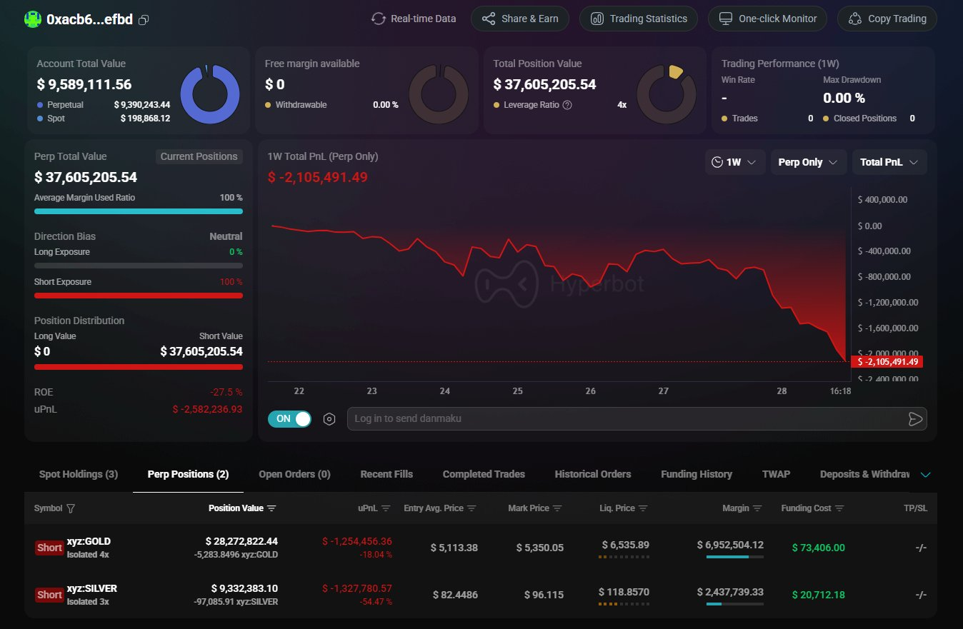 By combining macroeconomic fundamentals with Hyperbot's real-time on-chain monitoring, we turn our attention to the largest precious metals short whale on Hyperliquid (Address: 0xacb66d1996501bcc82a0e7819c9e041599f5efbd). This "Smart Money" player, commanding a multi-million dollar portfolio, is currently standing on the precipice of a forced system liquidation.