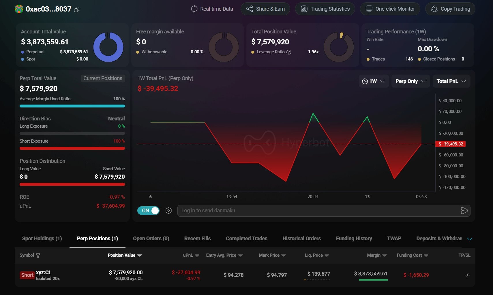 In the decentralized perpetual (Perp DEX) market, capturing the movements of "Smart Money" is often the prelude to anticipating major market pivots. Today, our monitoring system flagged an extraordinary case: a mysterious new address, 0xac03fc4c21902e4e934b4367cb1a6c6e3f0d8037, injected over $3.8 million in margin into Hyperliquid within the last 24 hours, dedicating the entire amount to establishing a short position in xyz:CL (WTI Crude Oil).