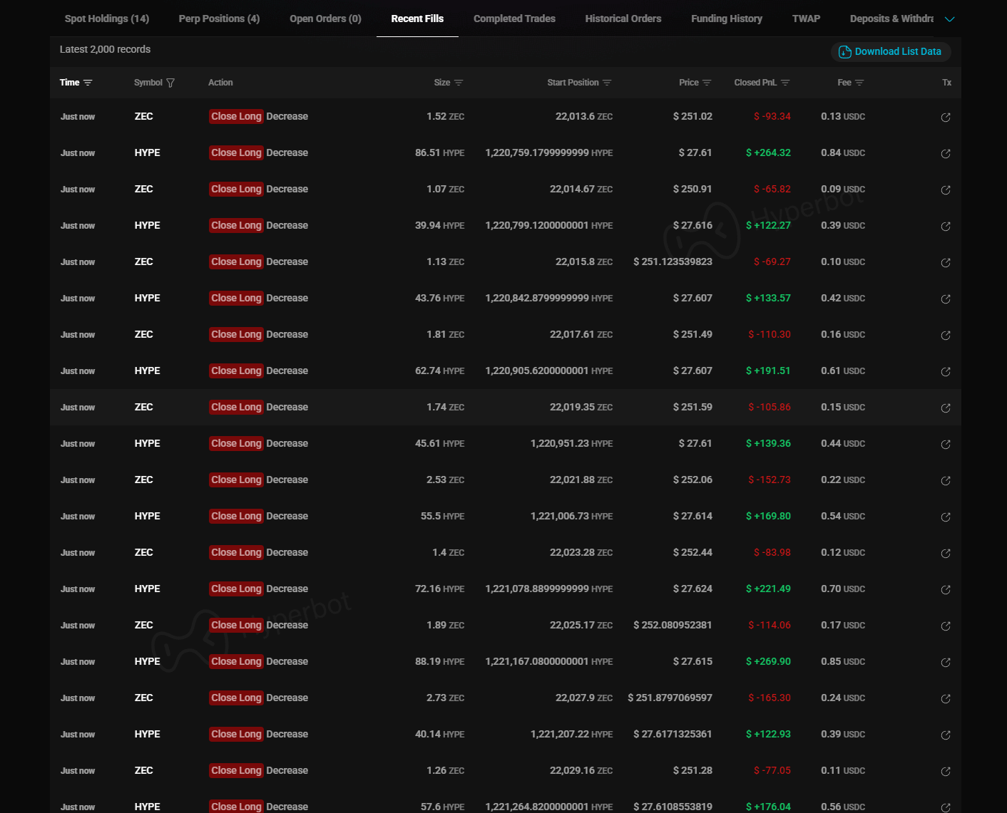 Analyst Take: What commands respect is the ruthless discipline of a top-tier trader. As the automated bot harvests HYPE profits, it is simultaneously executing a "bleeding close" on ZEC. Every ZEC close in the log is accompanied by red loss numbers (-$93.34, -$114.06, etc.). This is a classic portfolio rebalancing strategy: Using the profits from a winning asset (HYPE) to subsidize the amputation of a losing asset (ZEC). This proves he has abandoned any hopium for a ZEC rebound and decisively cut his losses to prevent further portfolio decay.
